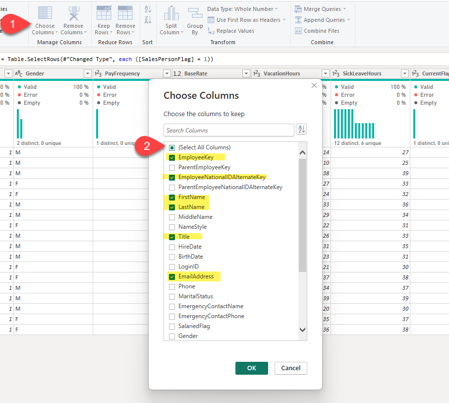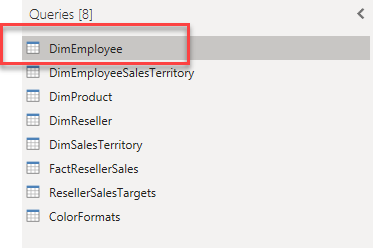 - In the Power Query Editor window, in the Queries pane, select the DimEmployee query.