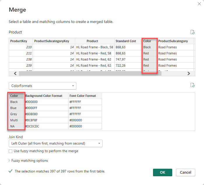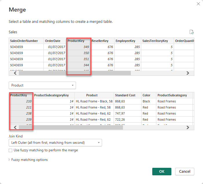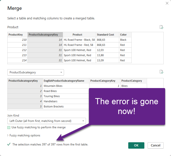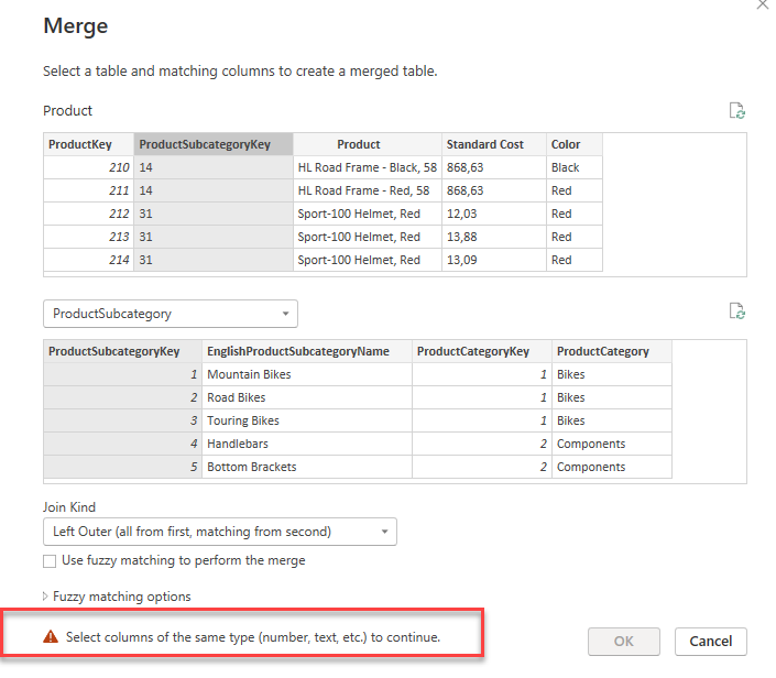 If you try to repeat the steps from the previous section, when we merged ProductSubcategory and ProductCategory, you’ll encounter an error, even though you are joining tables on the common column: