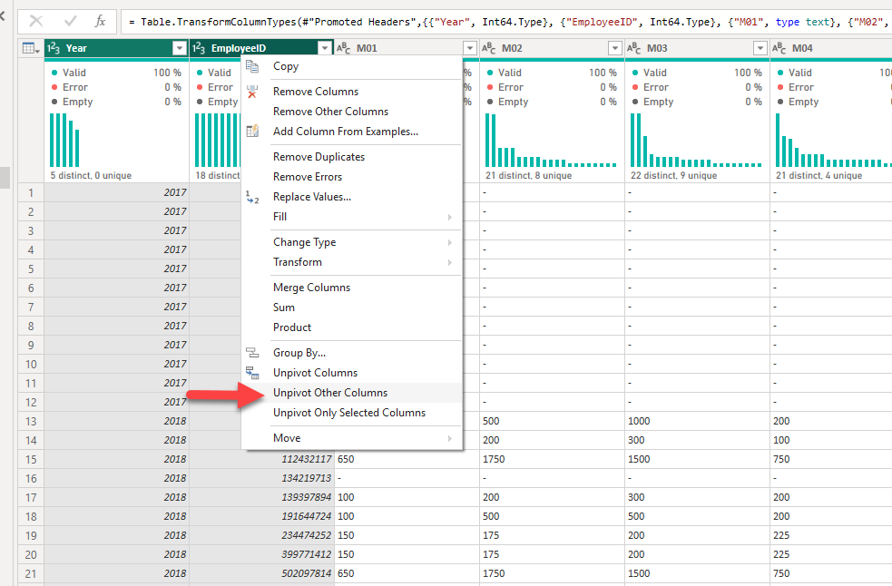 - To unpivot the 12 month columns (M01–M12), first multi-select the Year and EmployeeID column headers.