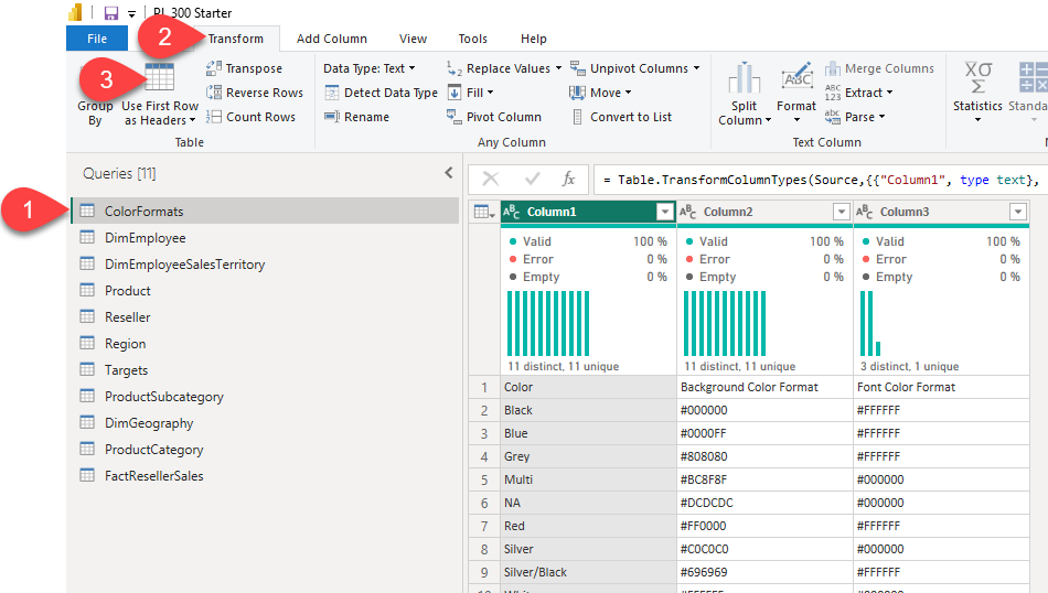 - Select the ColorFormats query and notice that the first row contains the column names.