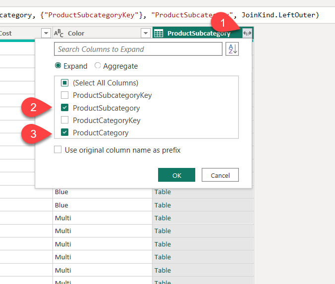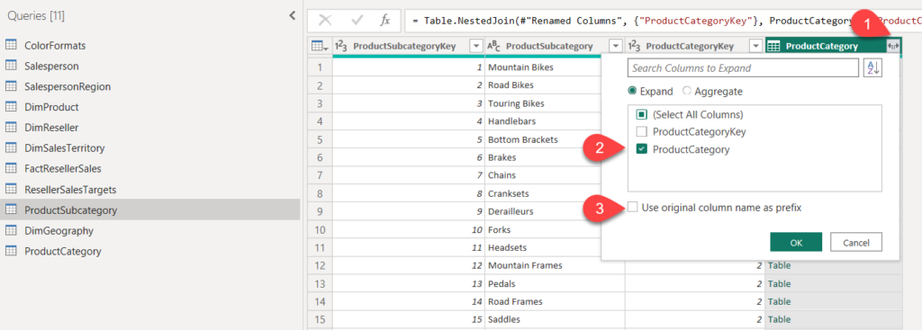 In the next step, we will combine columns from two different queries. We want to include the information about the product category in the ProductSubcategory query.