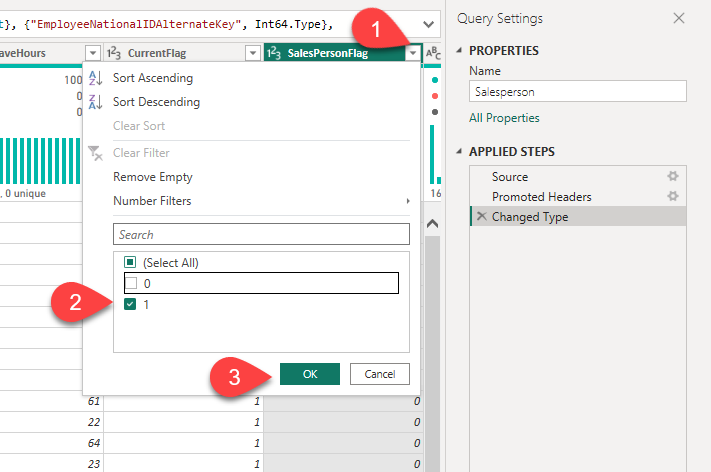 - Locate the SalesPersonFlag column, then click on the down arrow next to the column name, filter the column to select only Salespeople (that is, 1), and click OK.