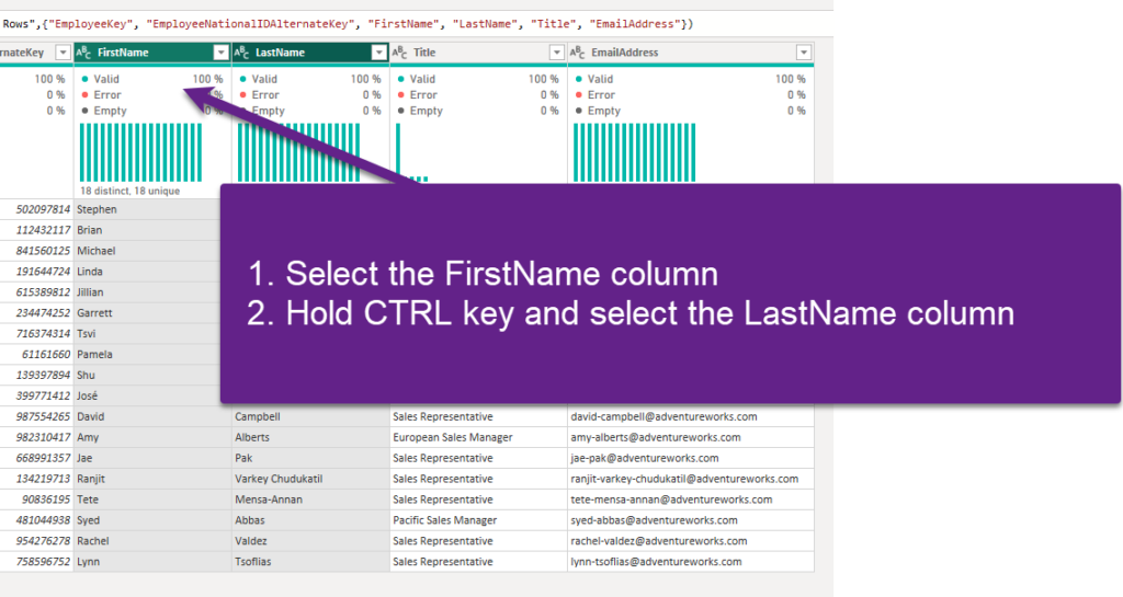 - Start by selecting the FirstName column header. While pressing the Ctrl key, select the LastName column.