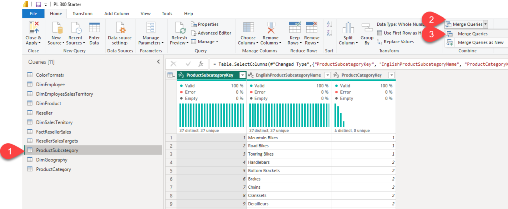 Select the ProductSubcategory query. In the Home ribbon, under the Combine area, click on Merge Queries, and then select Merge Queries from the drop-down menu: