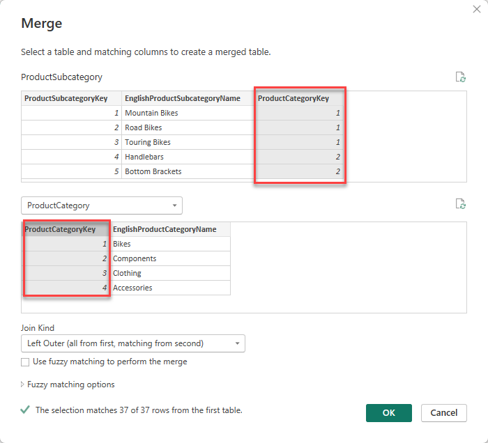 In the Merge dialog window, select the ProductCategory table and choose the ProductCategoryKey column in both tables. This is the common column between these two tables, and as such, it will be used to perform the Join operation.