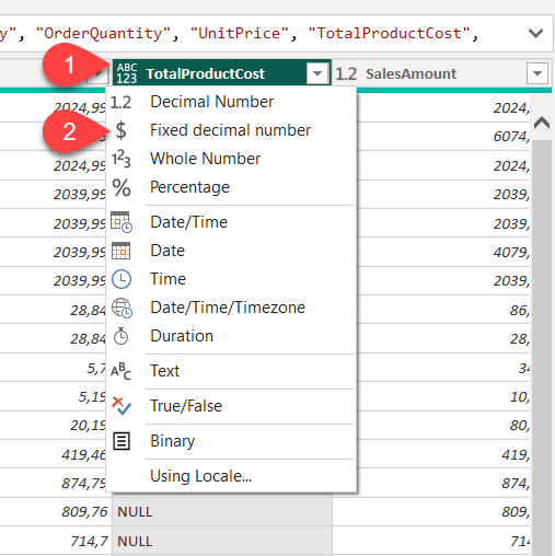 - Click on the ABC 123 icon next to the TotalProductCost column name