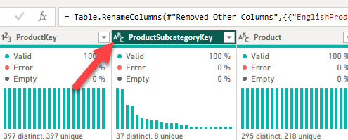 If you take a look at the Product table, you’ll notice that the ProductSubcategoryKey is of Text data type:
