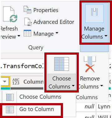 To locate a specific column, on the Home ribbon tab, from inside the Manage Columns group, select the Choose Columns down-arrow, and then select Go to Column.