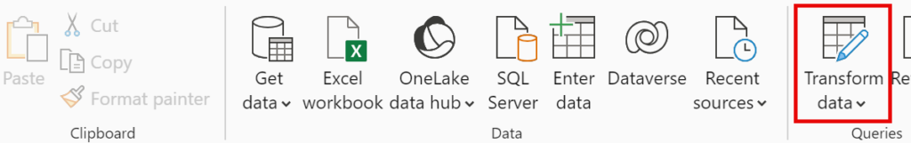 - To open the Power Query Editor window, on the Home ribbon tab, from inside the Queries group, select the Transform Data icon.