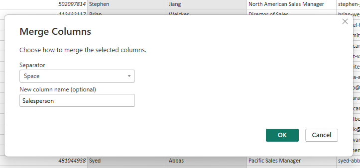The next step is to create a column: Salesperson, which will represent the full name of the salesperson. Currently, we have the FirstName and LastName as separate columns.