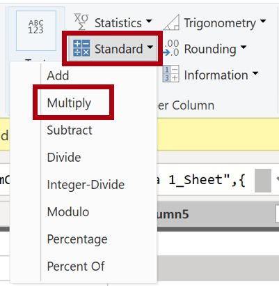 - To multiply the Target values by 1000, select the Target column header, and then on the Transform ribbon tab, from inside the Number Column group, select Standard, and then select Multiply.