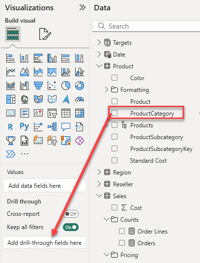 • Beneath the Visualizations pane, in the Drill Through section, add the Product | ProductCategory field to the Add drill-through fields here box.