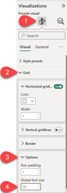 • To configure the format options for the visual, in the Grid section, set the Global font size property to 20pt.