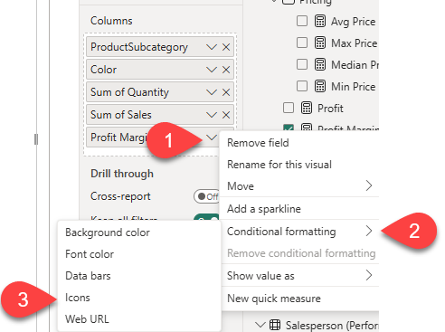 • Select the table visual. In the Columns box, select the down-arrow on the Profit Margin field, and then select Conditional formatting > Icons.