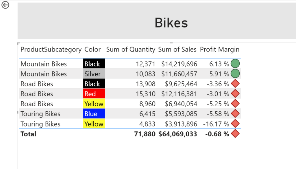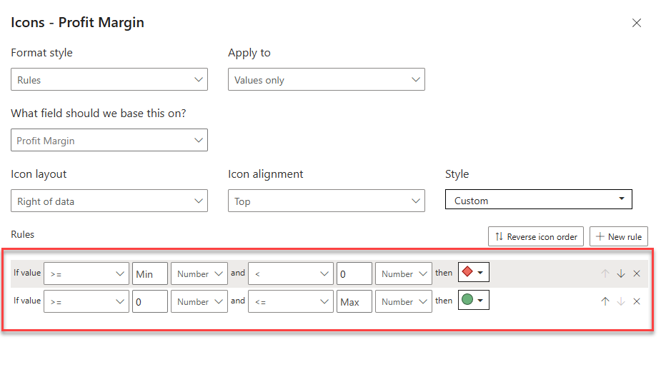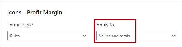 • In the Icons – Profit Margin window, in the Apply to dropdown list, select Values and totals.