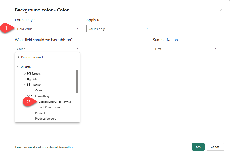 • In the Background Color – Color window, in the Format Style dropdown list, select Field Value.