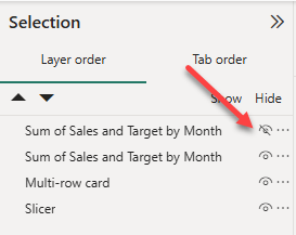 • In the Selection pane, beside one of the Sales and Target by Month items, to hide the visual, select the eye icon.