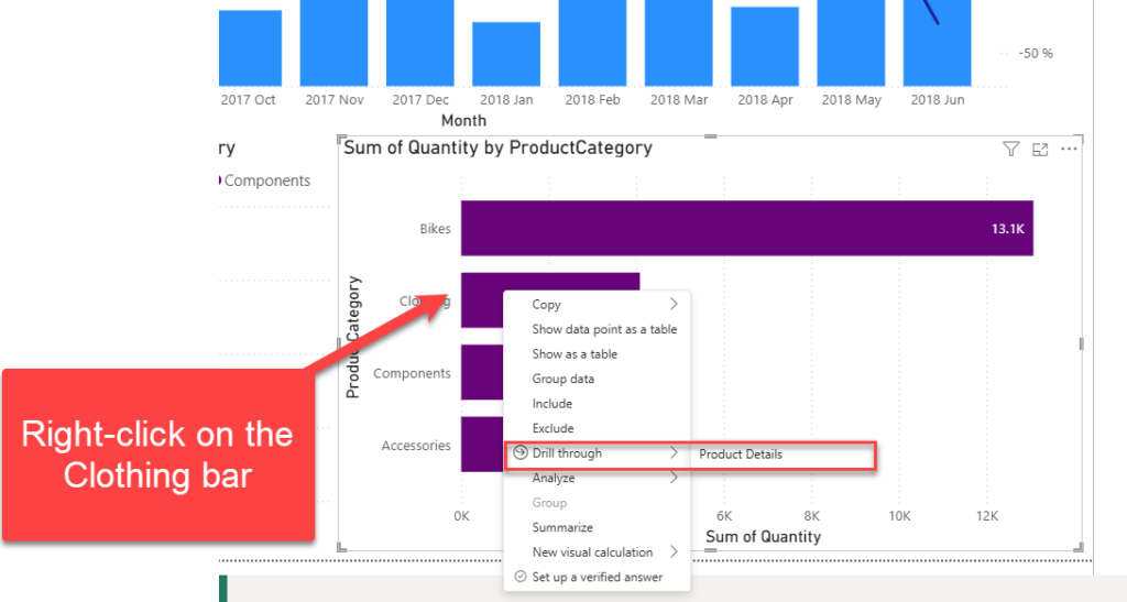 • Right-click on the data bar in the bottom right visual, and notice the Drill through option from the drop-down menu.