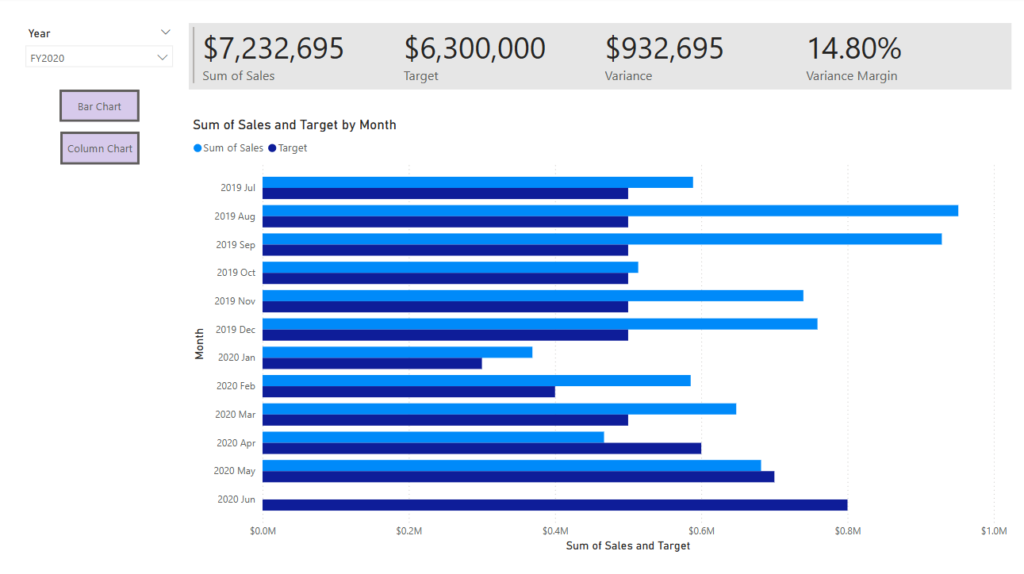 • Hold the CTRL key and click on the Column Chart button. Notice that now the column chart visual is displayed in the report