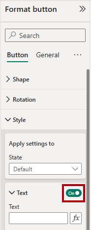 • Select the button, and then in the Format button pane, expand the Style section, and then set the Text section to On.
