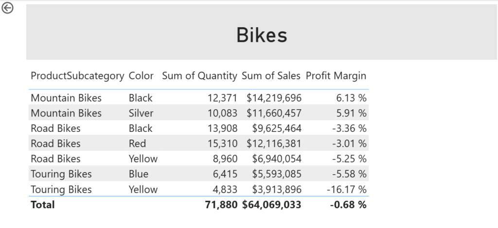 • To test the drill through page, in the drill through filter card, select Bikes.