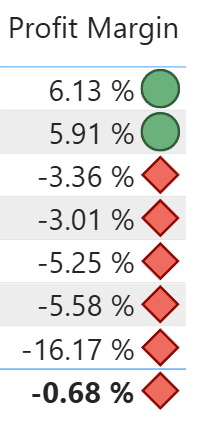 The rules can be interpreted as follows: display a red diamond if the profit margin value is less than 0; otherwise if the value is greater than or equal to zero, display a green circle.