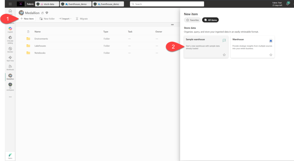 • Click + New Item. On the New item page, under the Store Data section, select Sample warehouse and create a new data warehouse with a name of your choice. After a minute or so, a new warehouse will be created: