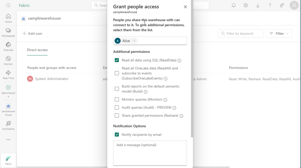 Item permissions control access to individual Fabric items within a workspace, like warehouses, lakehouses, and semantic models. In this part of the lab, you remove the Workspace Viewer permissions applied in the previous exercise and then apply item-level permissions on the warehouse so a less privileged user can only view the warehouse data, not the lakehouse data.