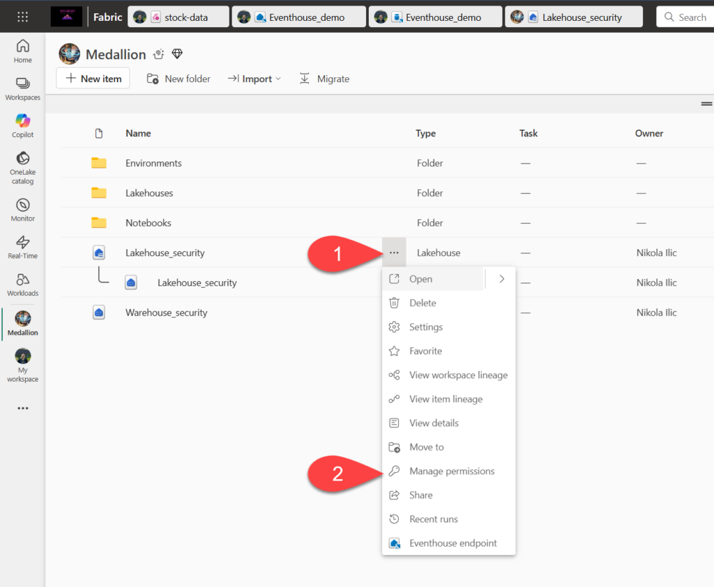 • Select Workspaces on the left menu and select your workspace. Hover over the name of the lakehouse.