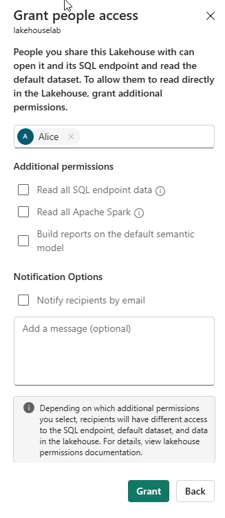 • Assign the second user to the lakehouse and ensure none of the checkboxes on the Grant People Access window are checked.