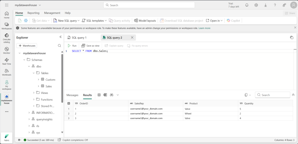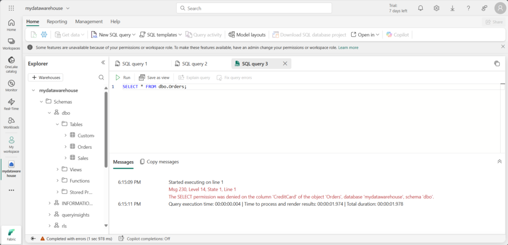 Microsoft Fabric permissions and granular SQL permissions work together to govern Warehouse access and user permissions. In this part of the lab, you’ll secure data using granular permissions, column-level security and row-level security,