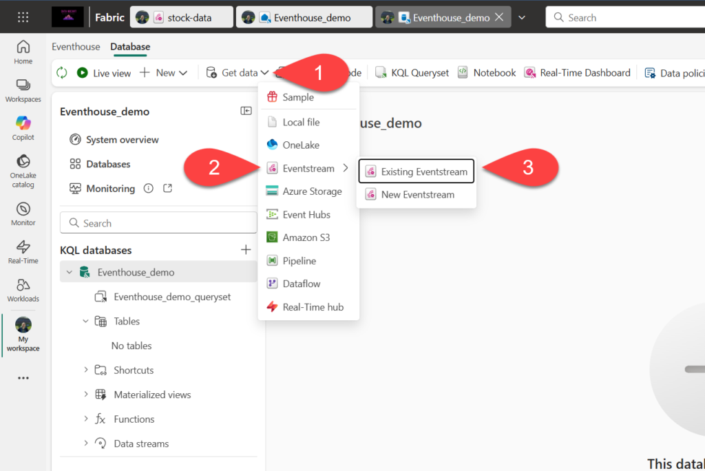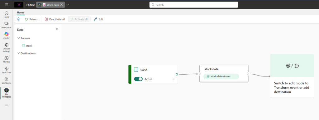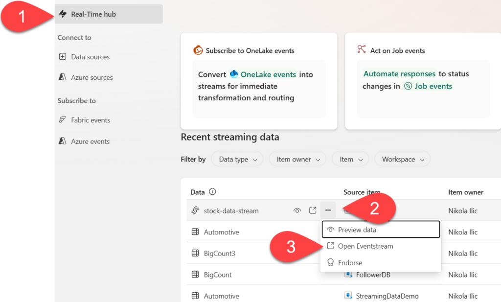 - In the menu bar on the left, select the Real-Time hub. In the … menu for the stock-data-stream stream, select Open eventstream.