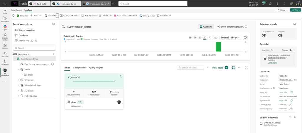 - Use the Next button to complete the steps to inspect the data and then finish the configuration. Then close the configuration window to see your eventhouse with the stock table.