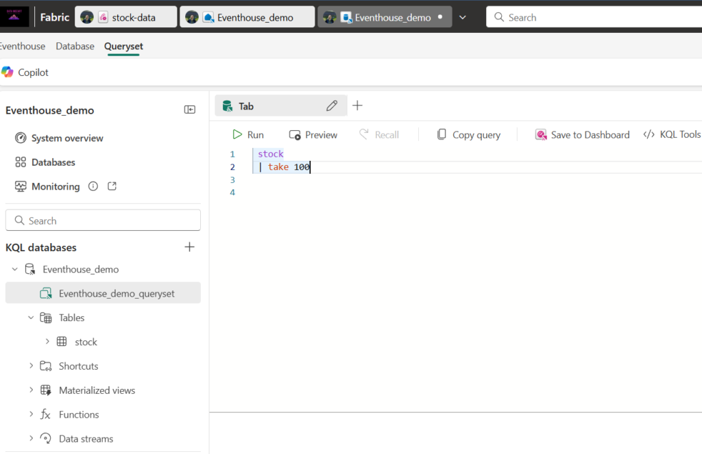 In the previous part of the lab, you’ve created a very simple eventstream that captures real-time data and loads it into a table. In a real solution, you’d typically add transformations to aggregate the data over temporal windows (for example, to capture the average price of each stock over five-minute periods). Now let’s explore how you can query and analyze the captured data.