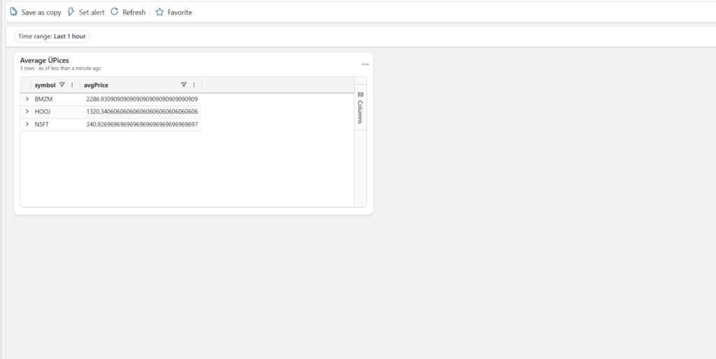 - Wait a few seconds and run it again, noting that the average prices change as new data is added to the table from the real-time stream.