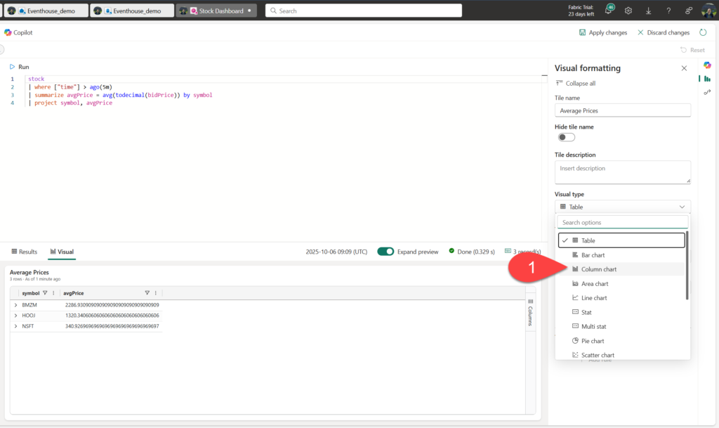 - In the query editor, select the KQL query you used to retrieve the average stock prices for the last five minutes.
