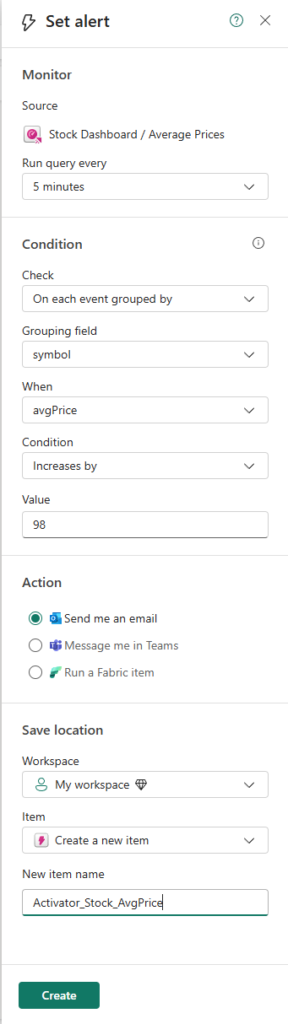 Real-Time Intelligence in Microsoft Fabric includes a technology named Activator, which can trigger actions based on real-time events. Let’s use it to alert you when the average stock price increases by a specific amount.