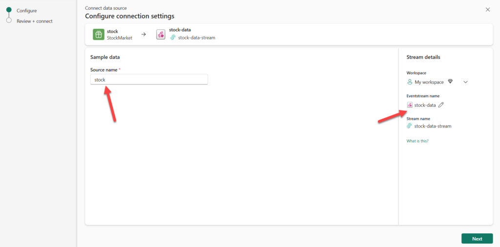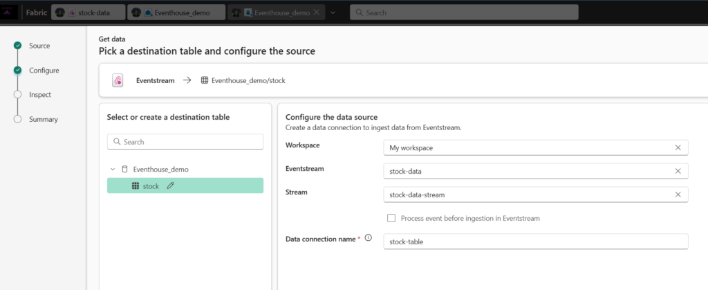 stock. Then in the Configure the data source pane, select your workspace and the stock-data eventstream and name the connectionstock-table.