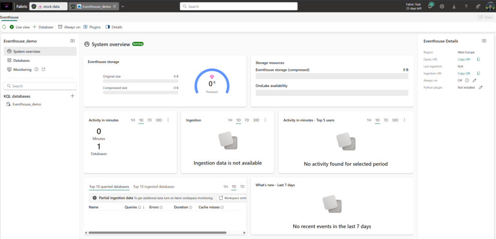 - In the pane on the left, note that your eventhouse contains a KQL database with the same name as the eventhouse. You can create tables for your real-time data in this database, or create additional databases as necessary.